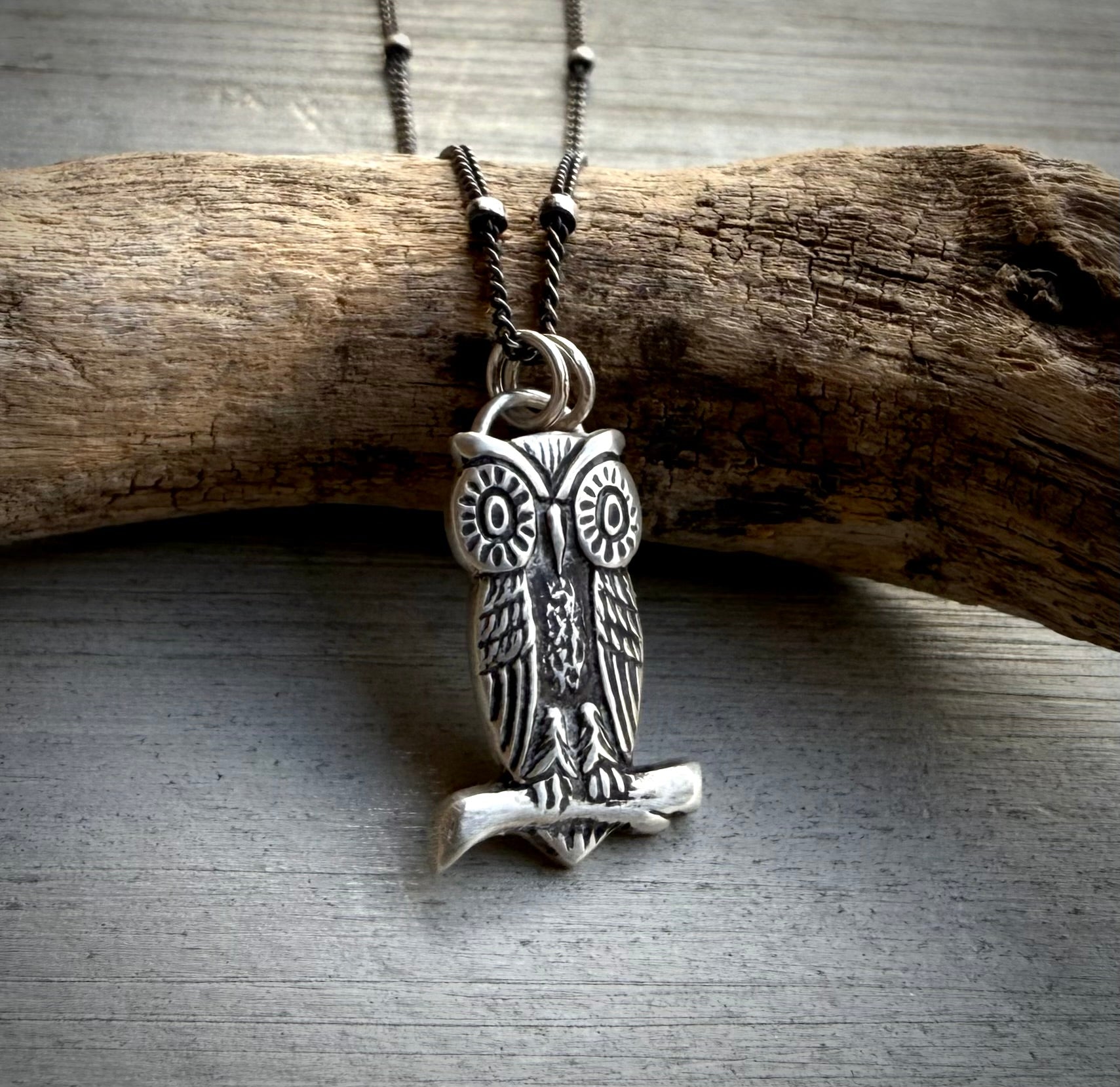 Beautiful handmade necklace featuring a textured owl design hand pressed into sterling silver sheet, with a second layer of silver backing this with artists makers mark “Gemstoned” hand stamped on rear, and is strung on an 18” sterling silver satellite chain. So perfect for everyday, and layering!