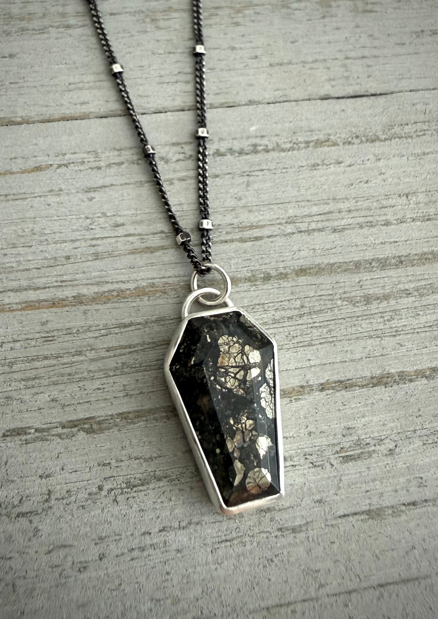 Beautiful handmade necklace featuring a natural Marcasite stone with a fancy coffin step cut, set in a crisp fine silver bezel atop a full sterling silver backing with artists makers mark “Gemstoned” hand stamped on rear, and is strung on an 18” sterling silver satellite chain.