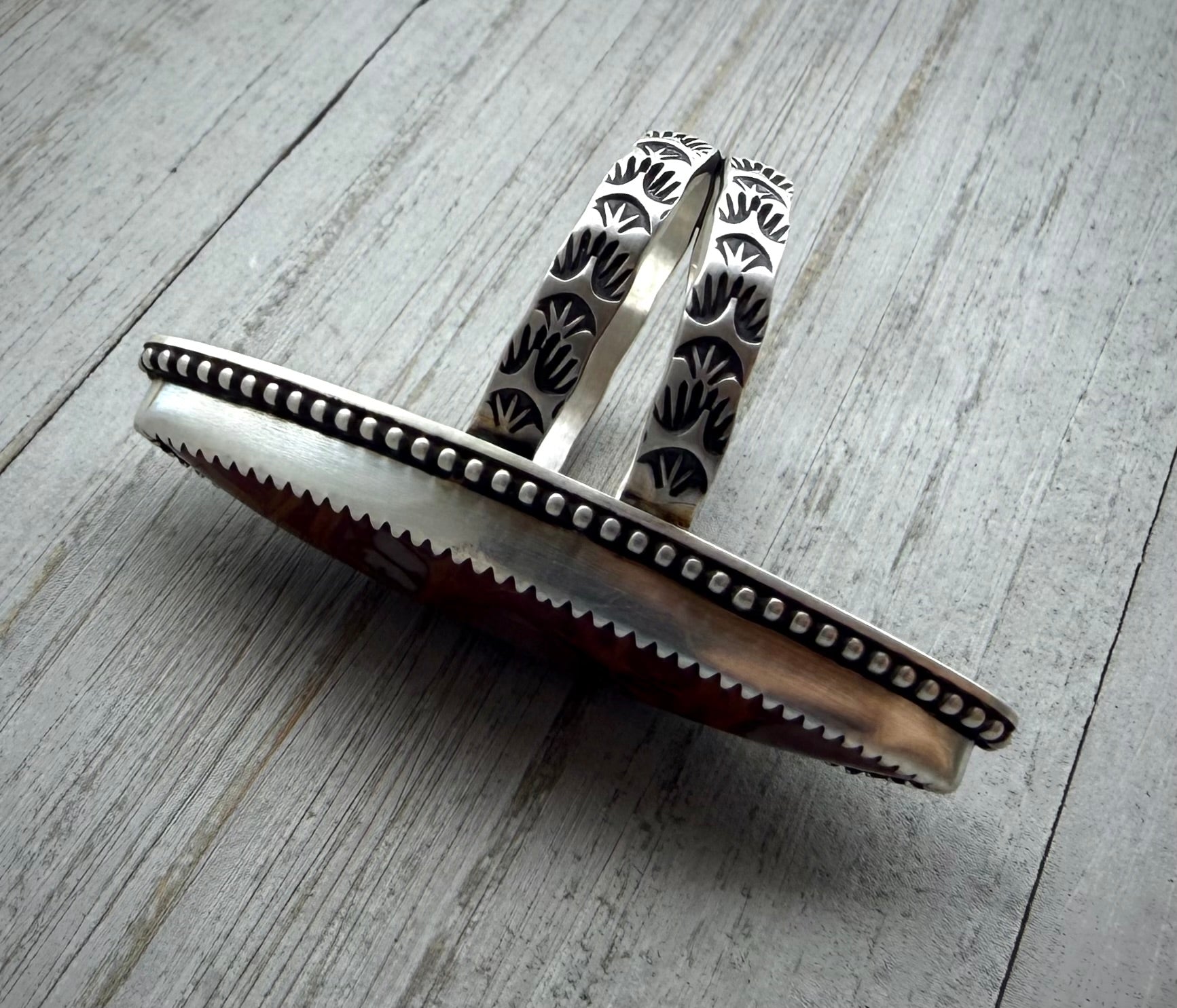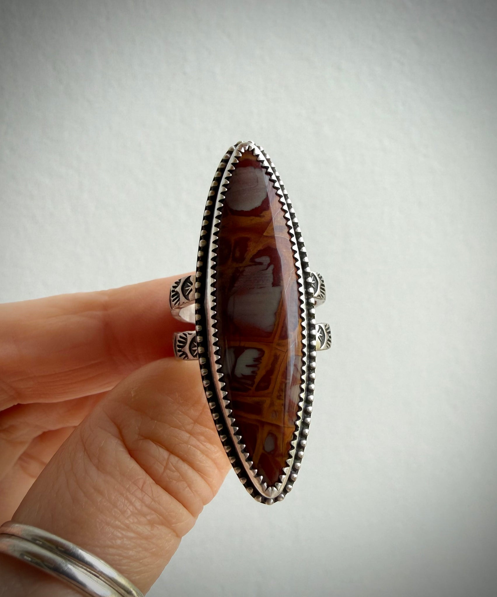 Gorgeous handmade ring featuring a large natural marquis cut Noreena Jasper stone with beautiful coloring and webbing, set in a serrated fine silver bezel with a decorative beaded border. This sits atop a full sterling silver backing with artists makers mark “Gemstoned” hand stamped on rear, and connects to a sterling silver double wide split shank ring band with a beautiful hand stamped design. A true one of a kind!