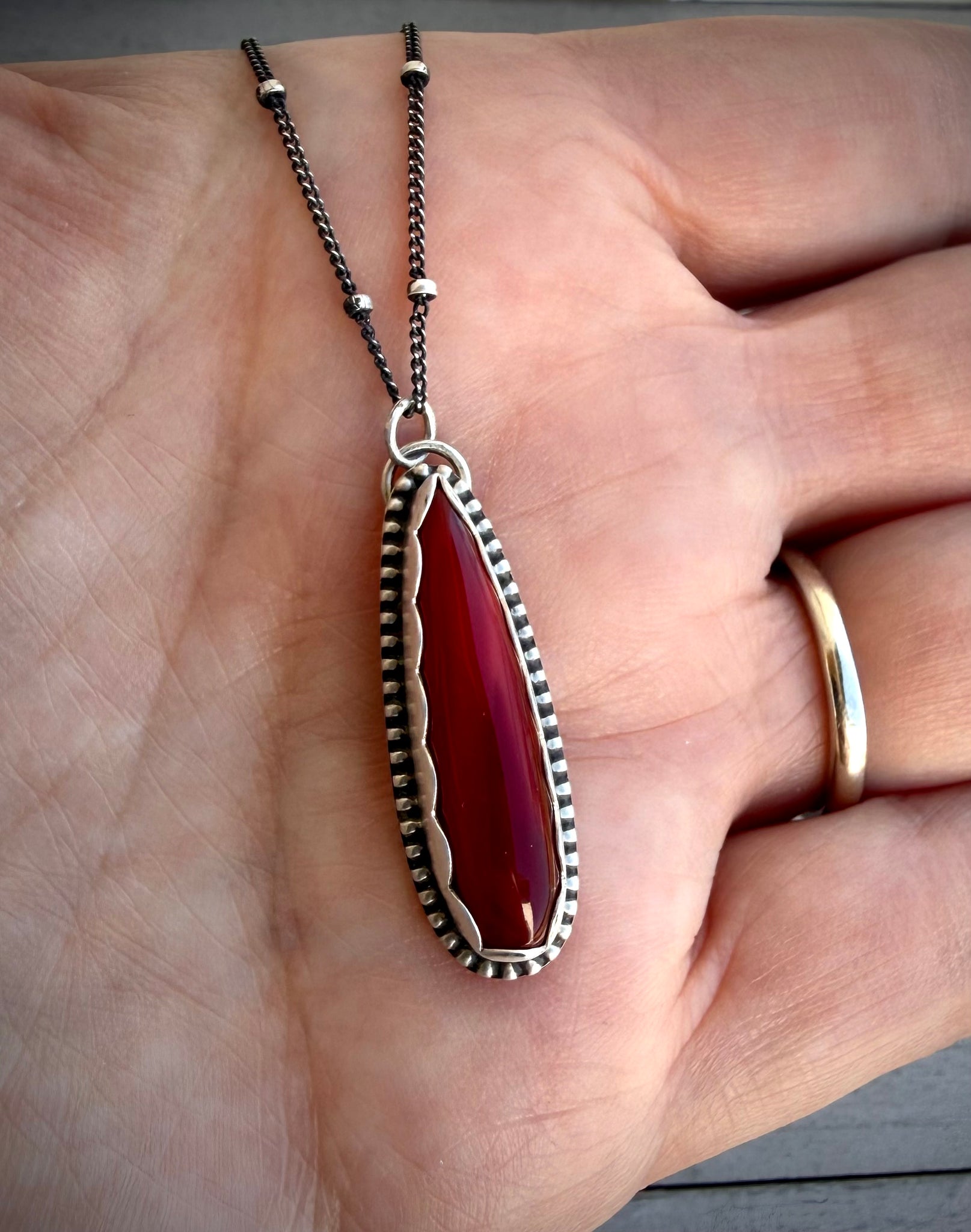 Beautiful handmade necklace featuring an elongated Rosarita teardrop set in a scalloped fine silver bezel with a decorative beaded border, set atop a full sterling silver backing with artists makers mark “Gemstoned” hand stamped on rear, and is strung on an 18” sterling silver satellite chain. A stunner!
