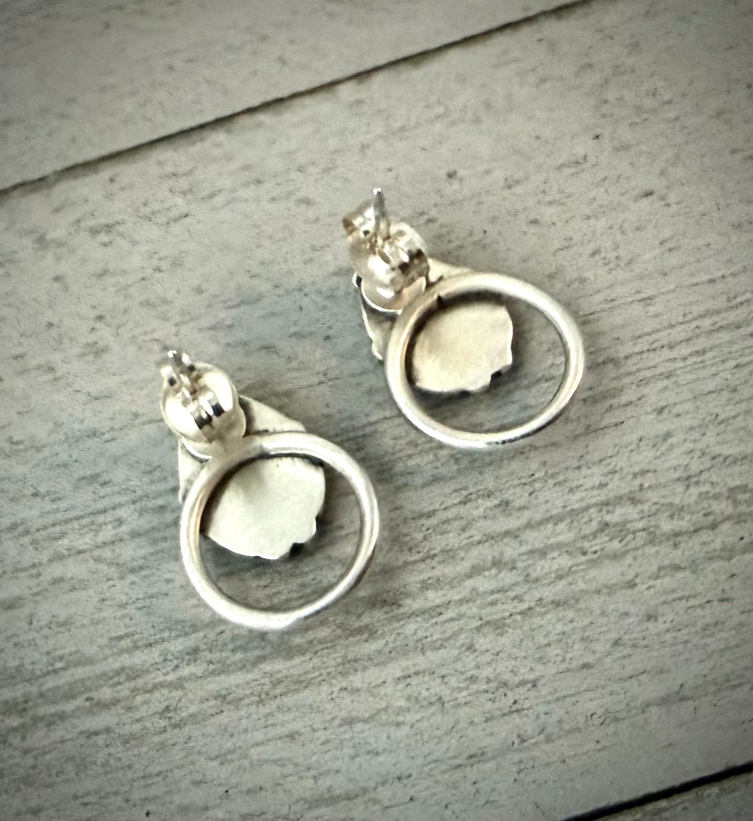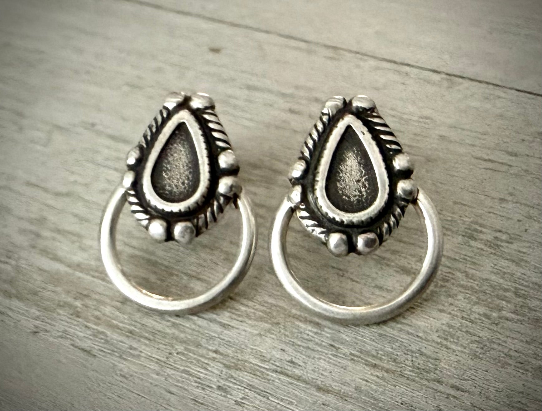 Petite statement stud earrings featuring a hand pressed teardrop design in sterling silver, with a sleek sterling silver hoop attached, with sterling silver ear posts & backs.