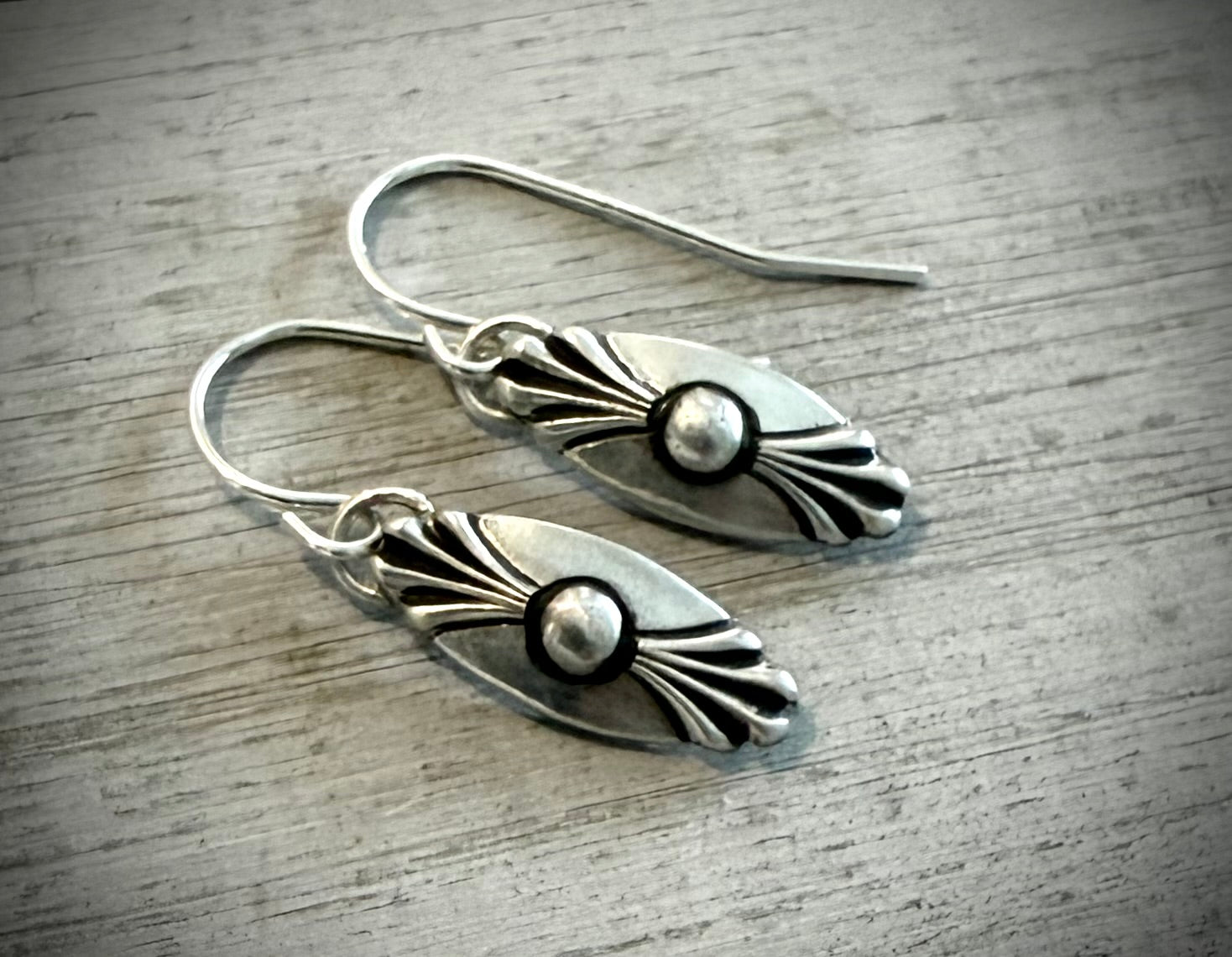 Beautiful handmade earring featuring a hand pressed design in solid silver, with sterling silver ear hooks & silicon backs.