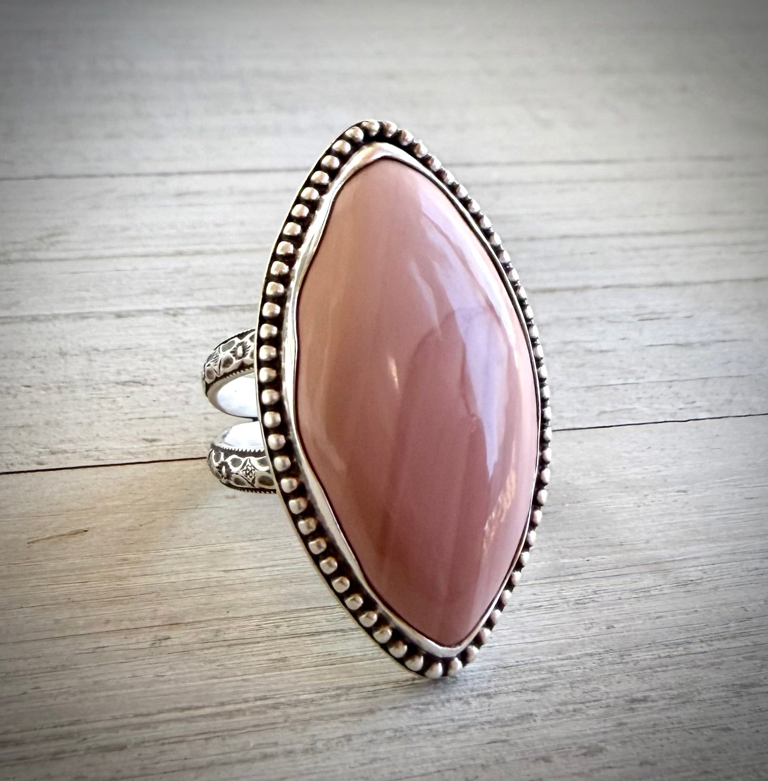 Beautiful handmade ring featuring a natural marquis cut Imperial Jasper stone with beautiful pastel pink coloring, set in a handmade fine silver bezel with a scalloped design, and a decorative beaded border. This sits atop a full sterling silver backing with a beautiful textured decorative design and artists makers mark “Gemstoned” hand stamped on rear, and attaches to a sterling silver split shank ring band with a beautiful antique design. A true one of a kind!