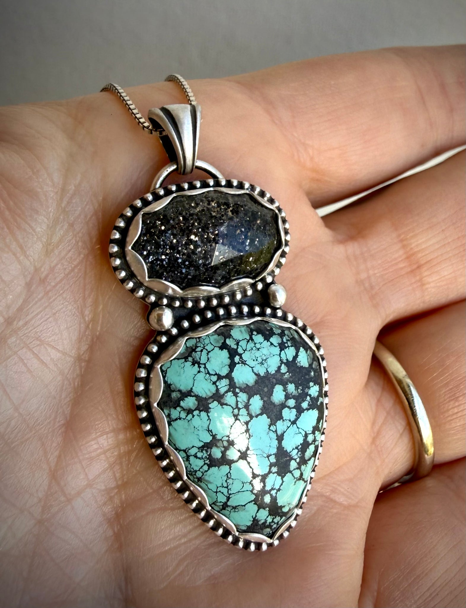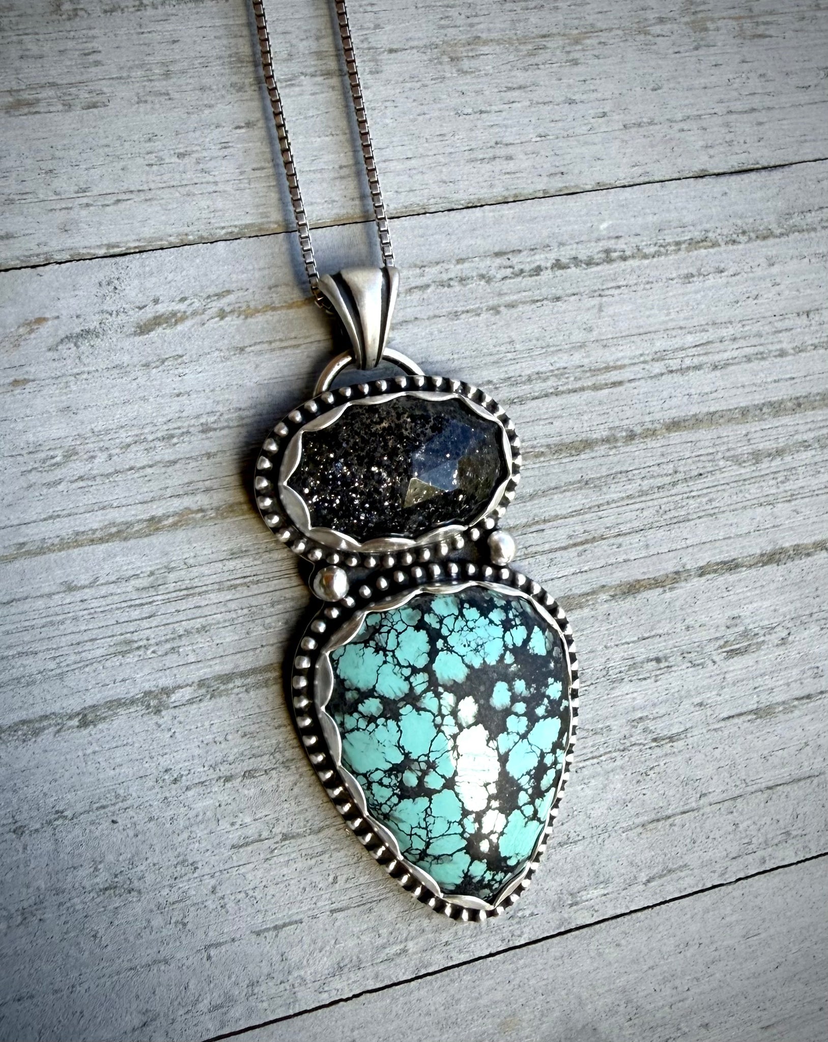Gorgeous handmade pendant featuring a natural oval shaped Midnight Quartz with a faceted cut and beautiful sparkle, that is paired with a teardrop shaped Hubei turquoise stone with a beautiful color and webbing. These two stones are set in scalloped fine silver bezels with a decorative beaded border and handmade fine silver beads placed centrally and set atop a full sterling silver backing with a decorative textured design and artists makers mark “Gemstoned” hand stamped on rear and attaches to a grooved sterling silver bail.