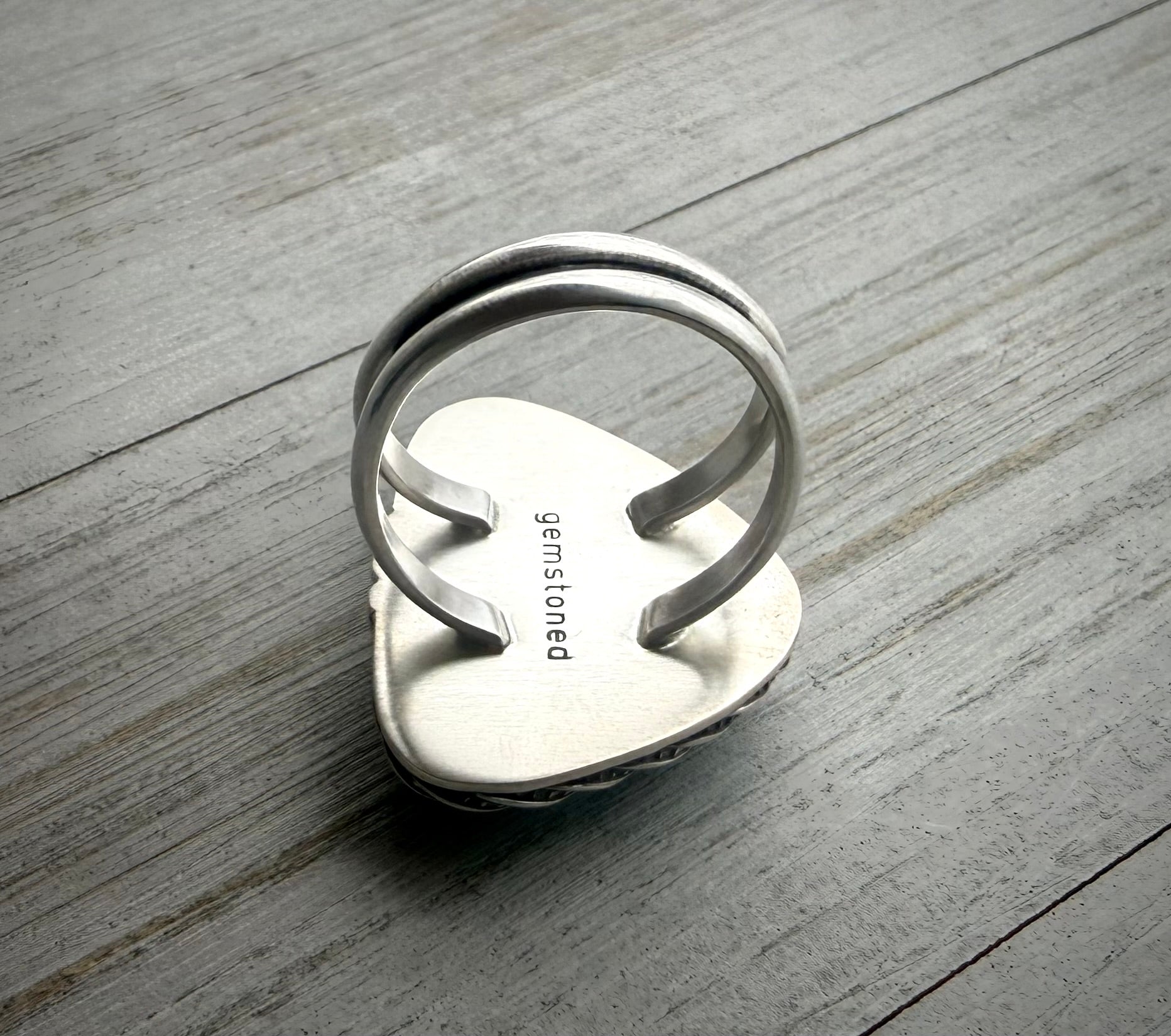Handmade ring featuring a natural triangular shaped Owyhee common Blue Opal stone, set in a crisp fine silver bezel with a dotted twist border and three handmade fine silver beads along one edge. This sits atop a full sterling silver backing with artists makers mark “Gemstoned” hand stamped on rear and attaches to a sterling silver split shank ring band.